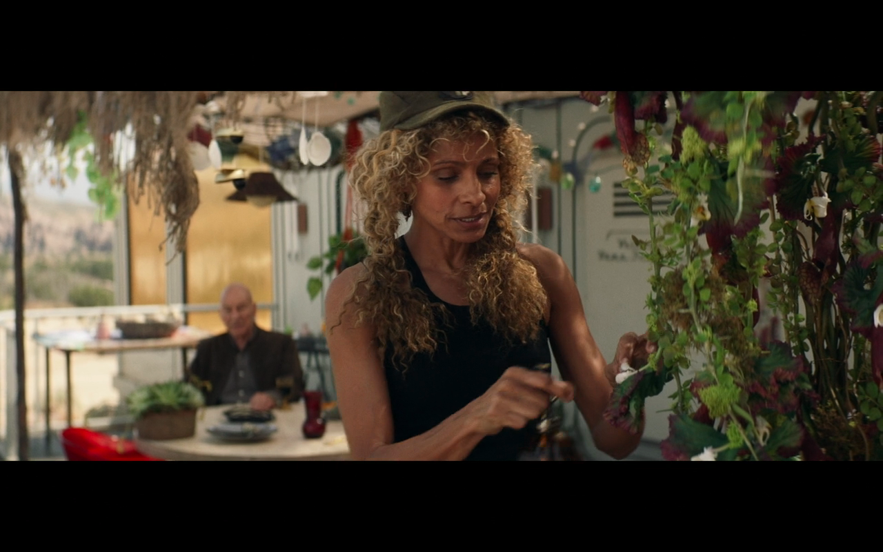 Star Trek Picard S1E3 Raffi Next to Snakeweed Vine and Trailer