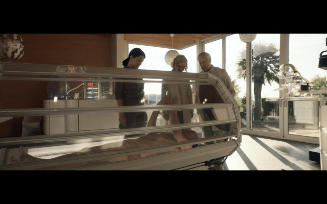 The four photos below contain many similar elements to Soji’s dream from episode 6, The Impossible Box. I was struck by the similarities between the dream and the scenes when Soong sees Narek and Sutra projected in Saga’s memories in episode 10. Saga is laying on a table, inert, with her memories playing over her- they look like a skylight. There are lamps overhead that are shaped like moons, but there are also windows with plants outside. The giant orchids circle over the compound. Soong and Agnes both hover near Saga.