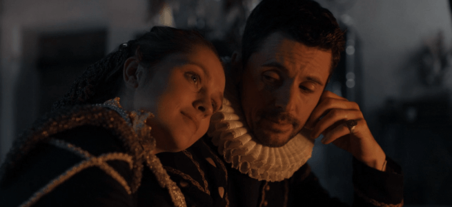 In episode 9, Matthew must answer to Queen Elizabeth for his failure to return Edward Kelley to England. Diana resumes her magical studies with Goody Alsop and makes substantial progress. Louisa and Kit confront Diana about the spell they think she’s cast over Matthew. Matthew and Diana realize their time in the 16th century is running out.