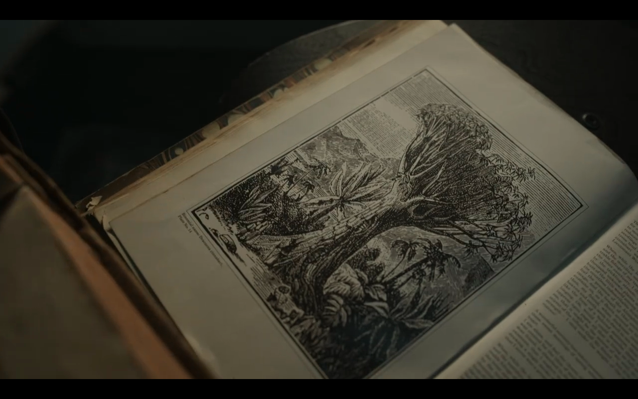 The tree in Layton’s vision has become more detailed, adding insects and birds. He searches Snowpiercer’s library for clues while Audrey tries to get information out of him about Asha and he ignores her. He finds a picture in a book that matches his vision and the sketch he drew from it.