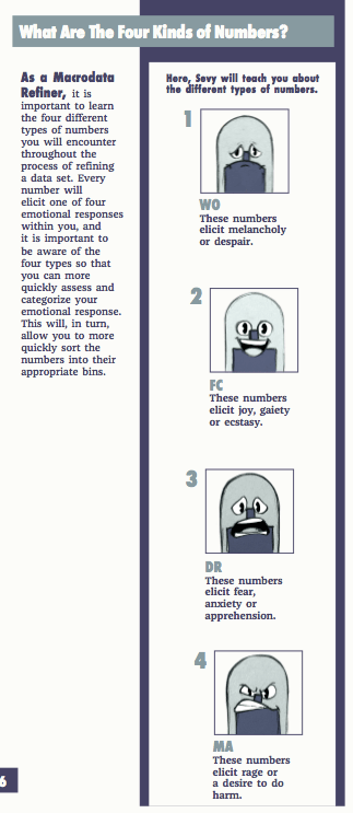 Helly is confused about how they sort lines of seemingly random digits into bins. Mark explains that “all of the data arrives from upstairs fully encoded.. Each category of numbers presents in such an order as to elicit an emotional response in the refiner. So, Cat 1 numbers, for example, feel a way on sight. They’ll be sort of disconcerting. Scary.”