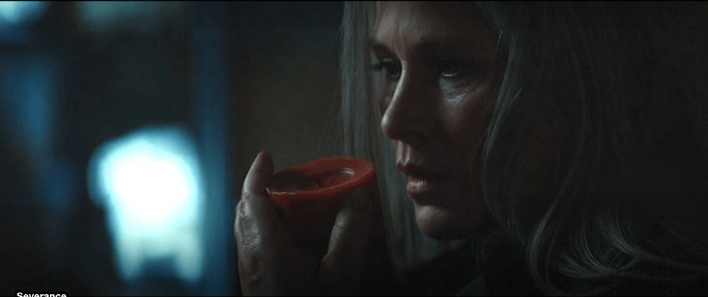 The robe is blue and red, action and danger, but blue is also symbolic of corporate loyalty and red signifies the spark of life- when one was threatened, so was the other. Severance affects the employees’ corporeality in some way we don’t understand yet. Maybe the chip copies their mind and has a kill switch that activates if its damaged, so that it can’t be removed. If true, that would be the reason why severance is irreversible and permanent. But maybe a version of the employee’s mind can outlive their body if they last long enough for their entire mind to be copied.