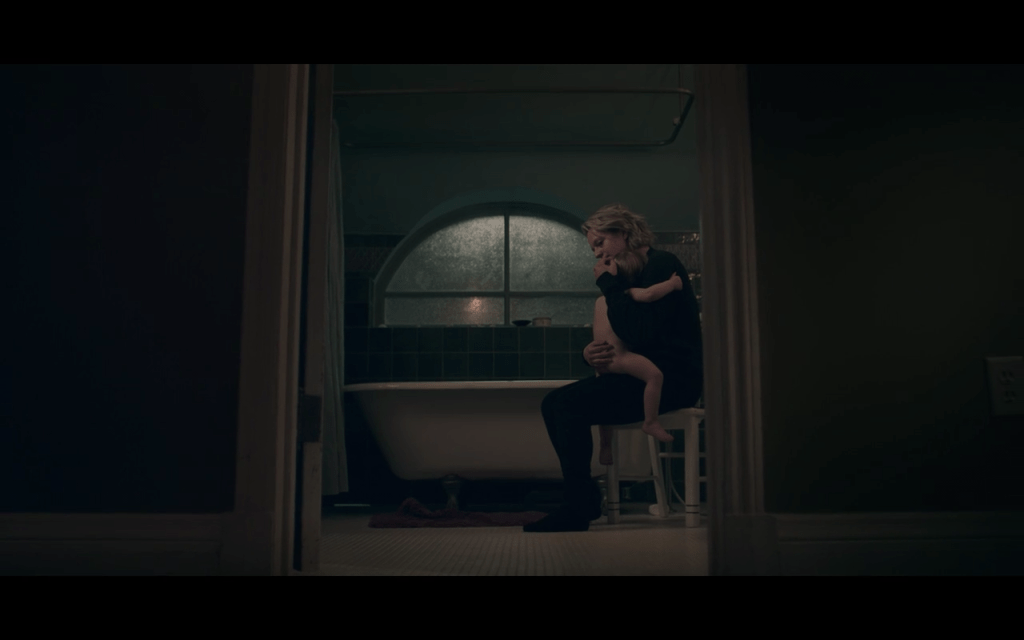 June creeps upstairs to the bathroom and looks in on Nichole’s bath. Luke notices her and coaxes her in to join them. Moira doesn’t object. June picks up and cuddles Nichole, who calms down after being fussy. Luke and Moira leave mother and daughter alone to bond and finish the bath.